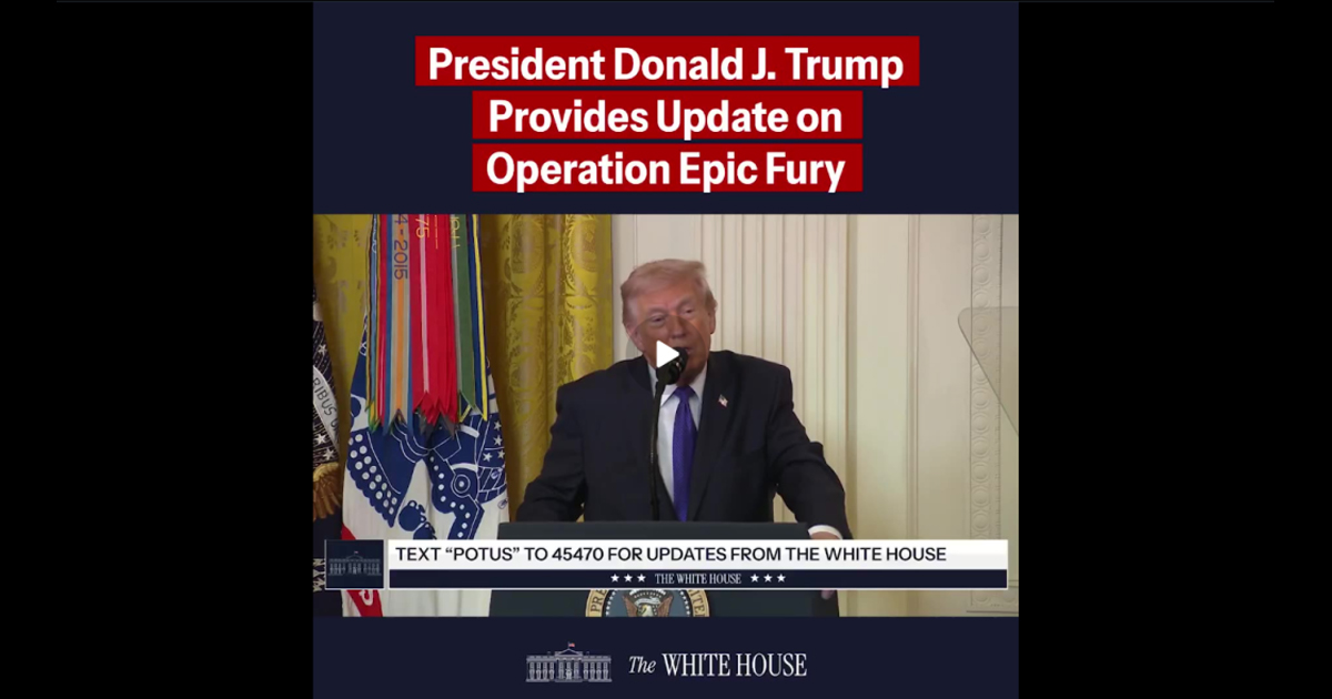 トランプ大統領は「Operation Epic Fury(オペレーション・エピック・フューリー)」に関する力強い最新情報を発表し、イランにおける軍事目標、弾道ミサイルによる脅威について概説するとともに、アメリカ及び海外駐留米軍を保護する米国の決意を改めて表明しました。