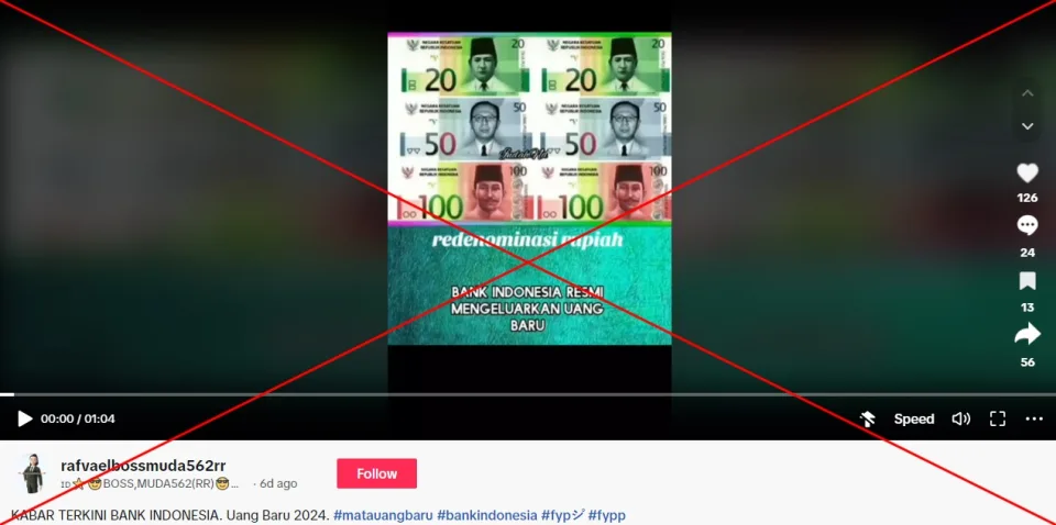 インドネシアの中央銀行は、ルピアから3つのゼロを削除することで、同国の銀行券を変更することを何年も検討してきたが、オンラインで何十万回も視聴されたビデオには、2024年3月に流通する新札は映っていない。銀行券が映っているように見える映像は、2013年1月に報道された、新しいルピアがどのようなものになるかを説明するニュースからの引用である。インドネシア銀行によれば、これらは法定通貨ではない。