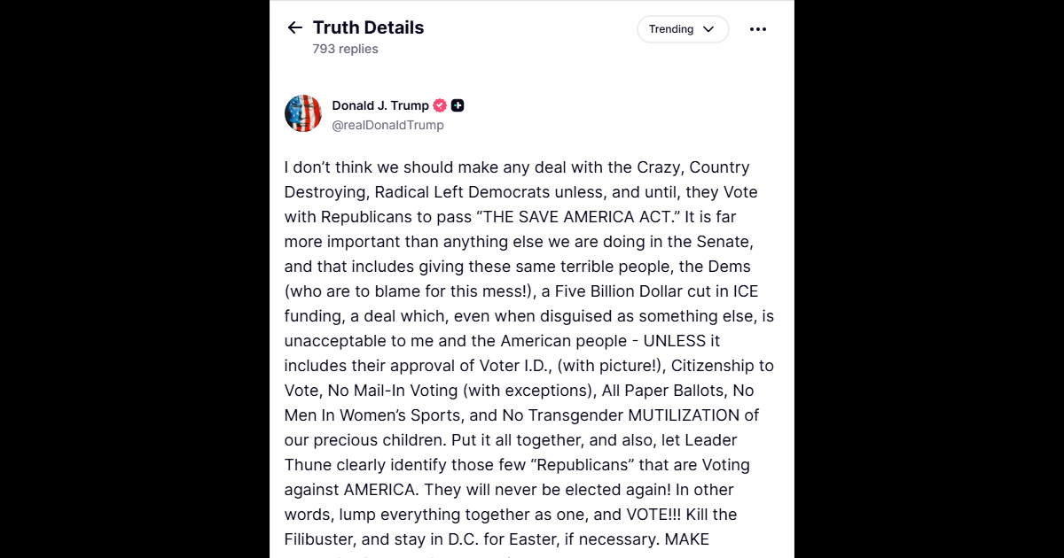 「セーブ・アメリカ法」を可決するために共和党と共同で投票するまでは、この国を破壊しようとする狂った急進左派の民主党員たちとは、いかなる取引もすべきではないと私は考えます。