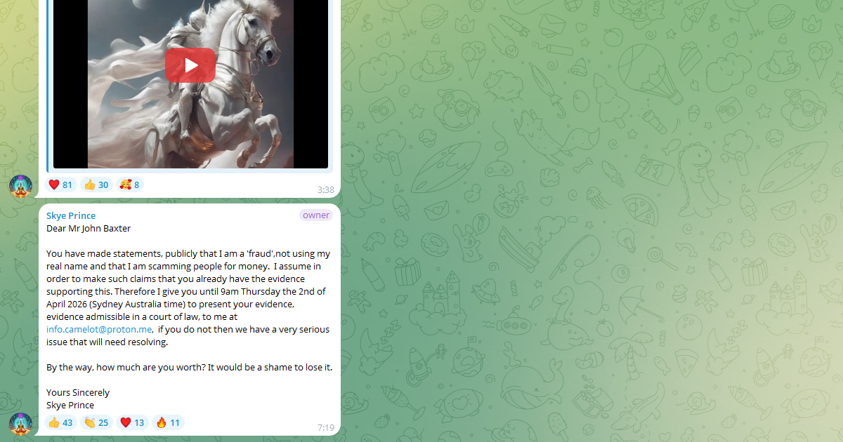 あなたは公の場で、私が「詐欺師」であり、本名を使用しておらず、金銭を騙し取っているとの発言をされています。そのような主張をする以上、それを裏付ける証拠をすでにお持ちであると推察いたします。つきましては、2026年4月2日(木)午前9時(オーストラリア・シドニー時間)までに、法廷で採用可能な証拠を info.camelot@proton.me までご提示ください。もしご提示いただけない場合、解決すべき極めて深刻な問題が生じることになります。