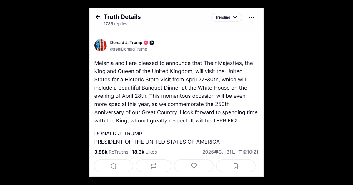 メラニアと私は、英国国王陛下ご夫妻が4月27日から30日にかけて、歴史的な公式訪問のため米国をご訪問されることをお知らせできることを嬉しく思います。