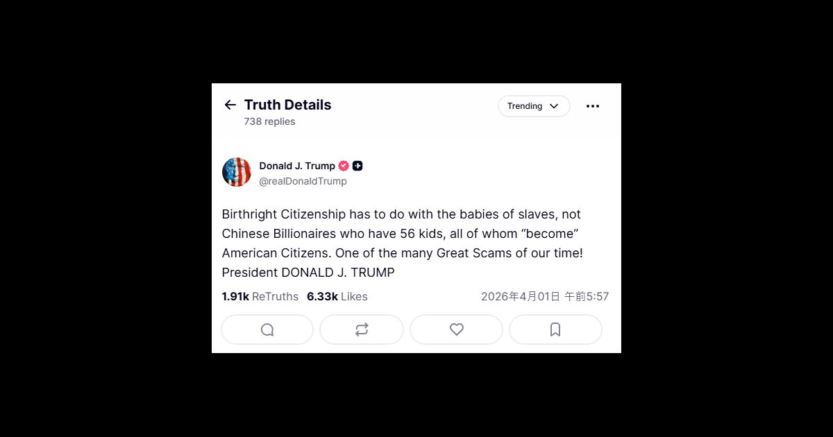 出生による市民権は、奴隷の子供たちに関するものであり、56人の子供をもうけ、その全員が「自動的に」米国市民となるような中国の億万長者とは無関係です。
