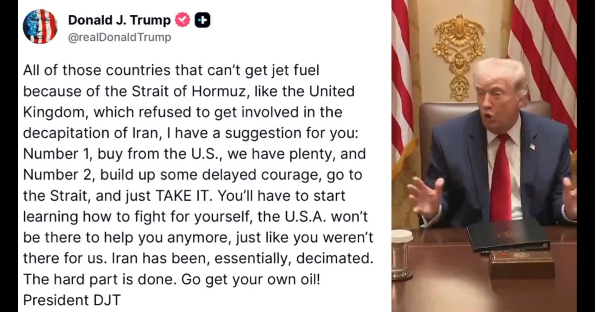 トランプ大統領は、何十年もの間、アメリカの力にただ乗りしながら、実質的な負担を一切分担することを拒んできた、いわゆる同盟国に対し、直接的な命令を下しました。大統領は彼らにこう語りました。ホルムズ海峡がイラン政権の残党によって封鎖され、現在ジェット燃料の確保に奔走している英国をはじめとするすべての国々は、アメリカの供給品を購入するか、あるいは自らその水路を奪還するだけの度胸を持つべきだ、と。