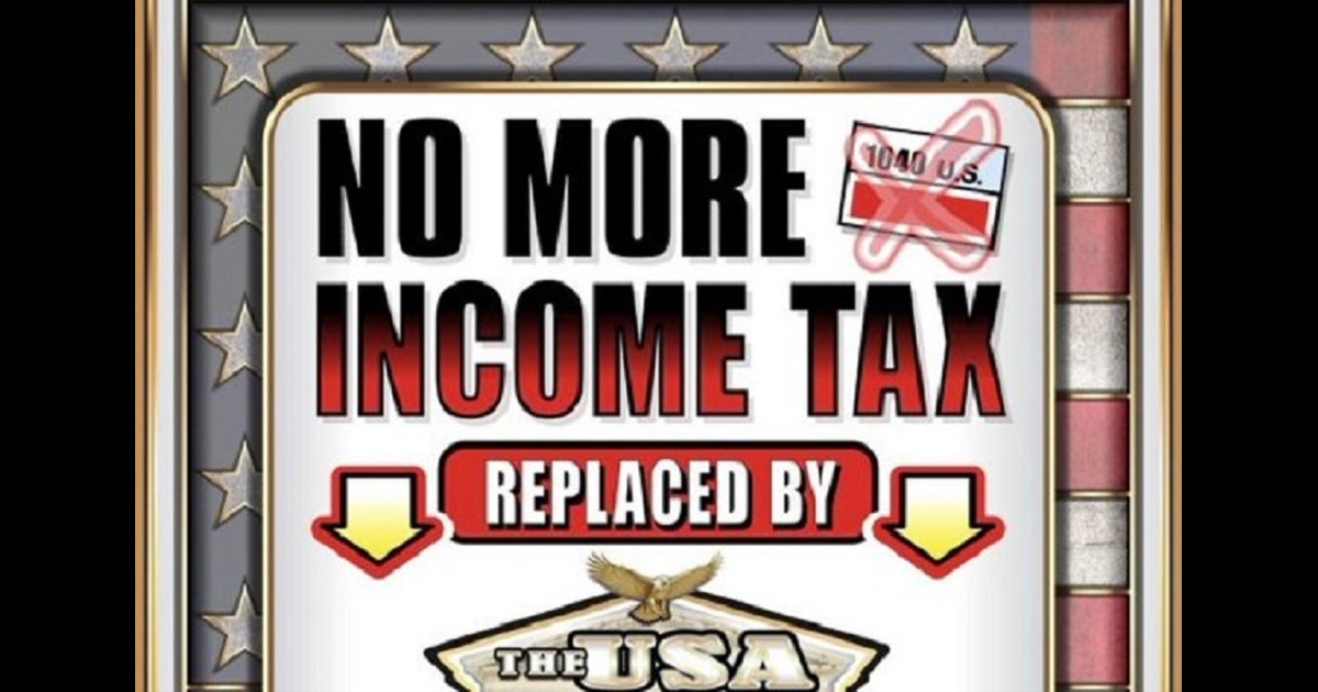 - 「NO MORE INCOME TAX(所得税はもういらない)」― これは単なる提案ではありません。これは宣言なのです。1040フォームの上に書かれた赤い「×」が、明確に示しています。この時代は終わったのです。
