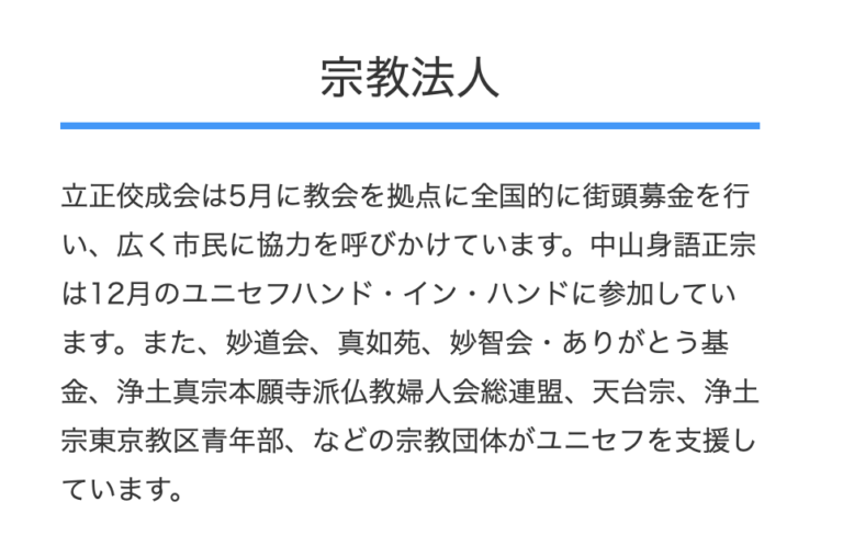 ユニセフの日本の窓口である「日本ユニセフ協会」は、皇后雅子の父である小和田恆(ひさし)など創価学会とつながりの深い人物によって設立され、真如苑など複数の宗教団体から支援を受けています。