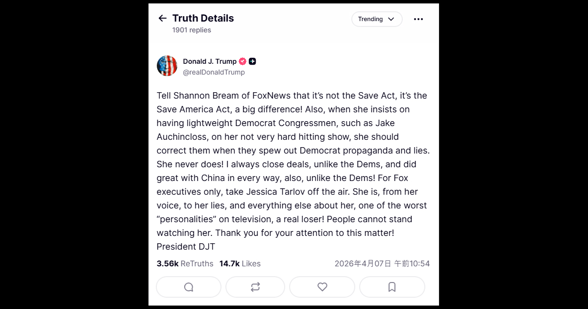ソース:https://truthsocial.com/@realDonaldTrump/posts/116360927697862375