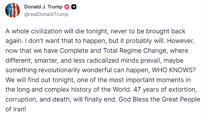 ドナルド・トランプ大統領は「Truth Social」で直接的な警告を発しました。「今夜、1つ文明が滅び、2度と復活することはないだろう」と述べたのです。大統領は、そのような結末は望んでいないものの、イランが午後8時までの期限までにホルムズ海峡を再開し、提示された条件を受け入れない限り、事態はそうなると予想していると述べました。