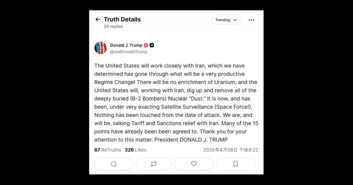 ソース:https://truthsocial.com/@realDonaldTrump/posts/116368825638596650