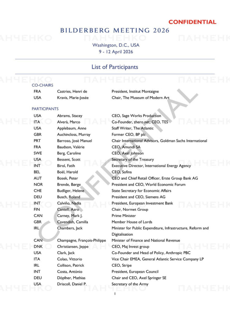 2026年のビルダーバーグ会議の参加者リストが流出したところによると、Palantirと関係のある重要人物たちが、現職の世界的指導者、諜報機関とつながりのある内部関係者、そしてメディア界の有力者らと共に、4月9日から12日までワシントンD.C.で、世間の目を避けて非公開の会合を開く予定であることが明らかになりました。
