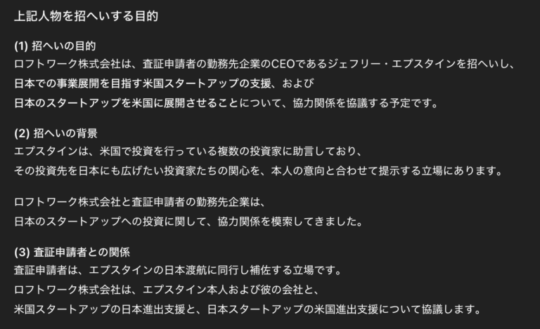 エプスタインファイルによると、ロフトワークはエプスタインを日本に招き、彼が助言していた投資家たちの関心や資金を、日本のスタートアップ企業につなげようとしていたと見られます。