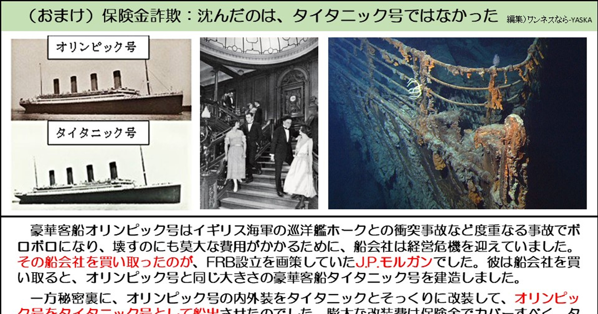 豪華客船オリンピック号はイギリス海軍の巡洋艦ホークとの衝突事故など度重なる事故でボロボロになり、壊すのにも莫大な費用がかかるために、船会社は経営危機を迎えていました。 その船会社を買い取ったのが、FRB設立を画策していたJ.P.モルガンでした。彼は船会社を買い取ると、オリンピック号と同じ大きさの豪華客船タイタニック号を建造しました。