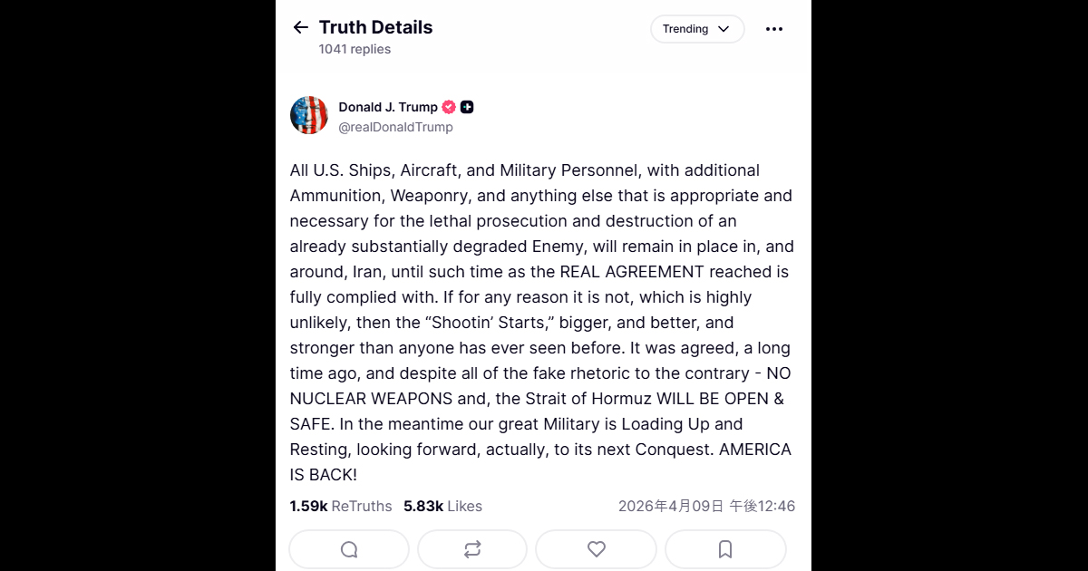 すでに著しく弱体化した敵を徹底的に攻撃・殲滅するために適切かつ必要とされる、追加の弾薬、兵器、その他あらゆる物資を備えたすべての米軍艦艇、航空機、および軍関係者は、真の合意が完全に履行されるまで、イラン国内およびその周辺に留まることになります。