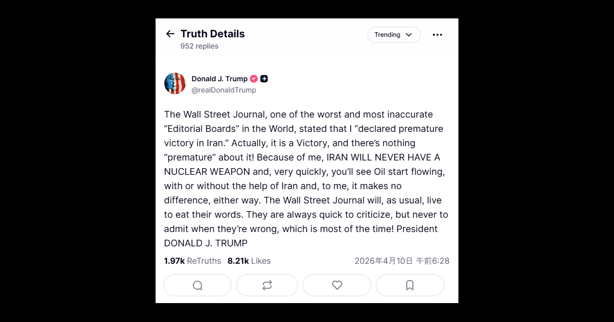 ソース:https://truthsocial.com/@realDonaldTrump/posts/116376868752554780