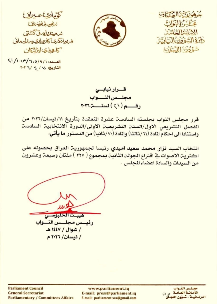 イラク議会は土曜日、2回目の投票でニザール・アメディ氏が227票を獲得したことを受け、同氏を議長に選出しました。