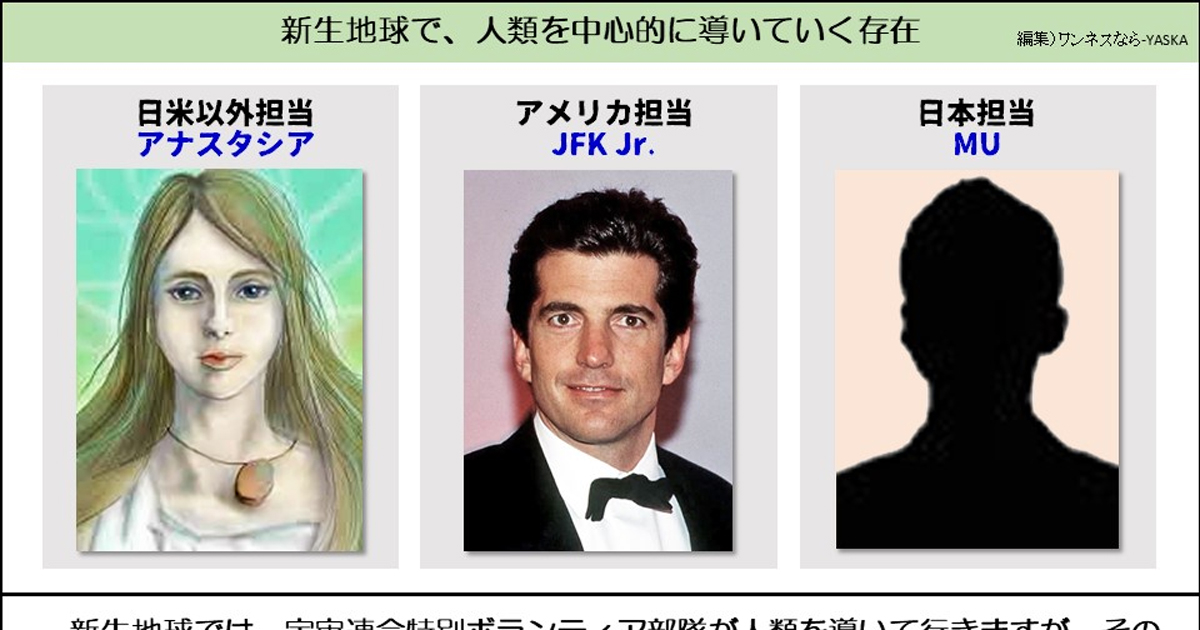 新生地球では、宇宙連合特別ボランティア部隊が人類を導いて行きますが、その中心を担うのが、レムリア・縄文時代の「一族の土地」を実現させようとしているアナスタシア、トランプから「君は彼らがいなくなった後のアメリカを導いてくれ」と言われていたJFK Jr.、そしてキリストの生まれ変わりで新生地球の先導役日本にいるMUです。この3人の担当は上記の通りです。