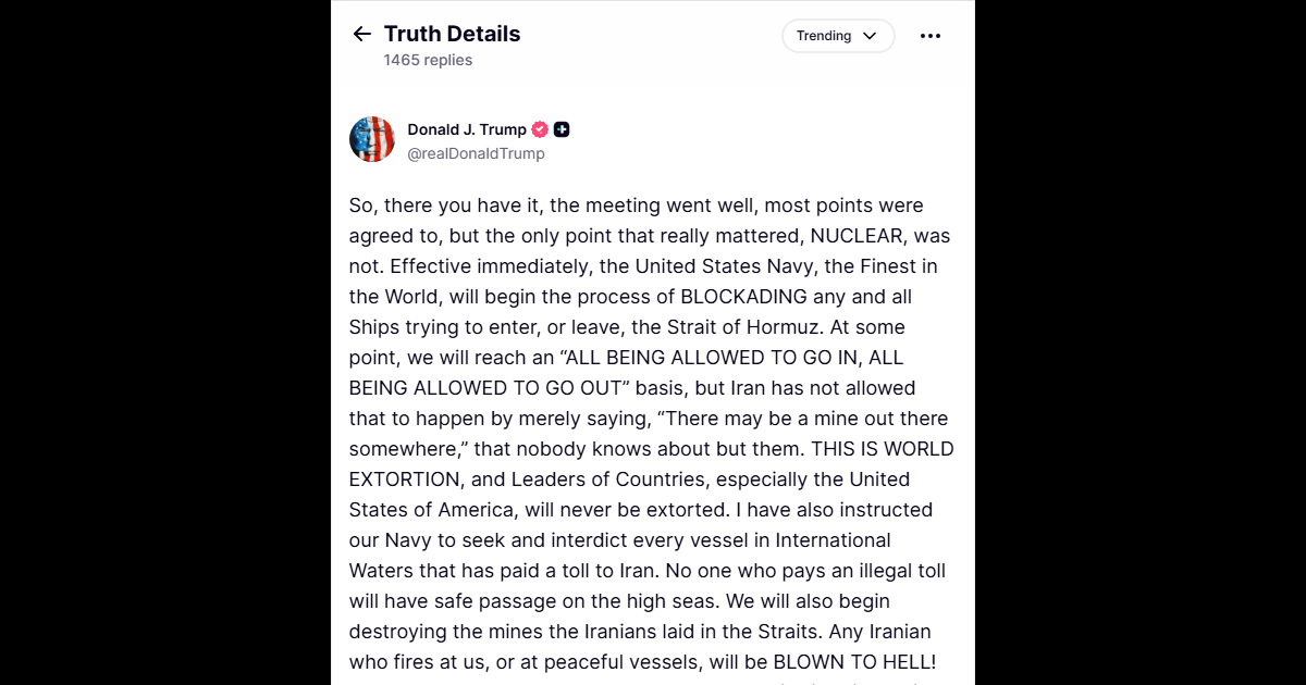 即刻より、世界一の海軍である米国海軍は、ホルムズ海峡への出入りを試みるあらゆる船舶を封鎖する措置を開始いたします。