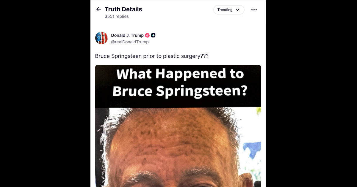 整形手術を受ける前のブルース・スプリングスティーン??? 自然・科学(化学) X コピー 2026.04.13 ソース:https://truthsocial.com/@realDonaldTrump/posts/116392655867913780 ブルース・スプリングスティーンに何が起こったのか?