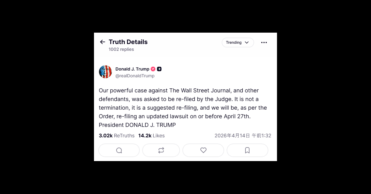 ソース:https://truthsocial.com/@realDonaldTrump/posts/116398354806956903