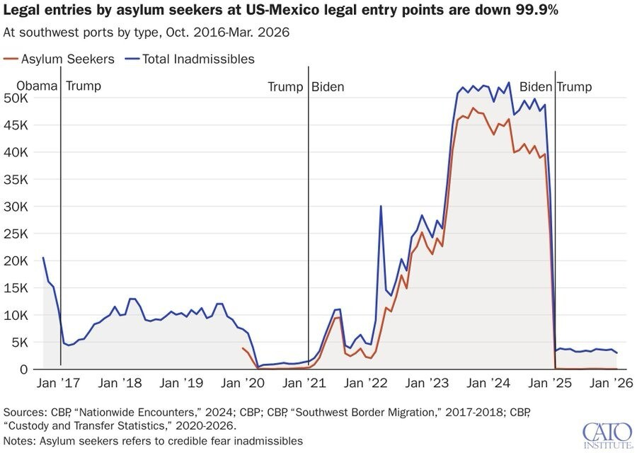 米国とメキシコの合法入国地点における亡命希望者の合法入国は99.9%減少