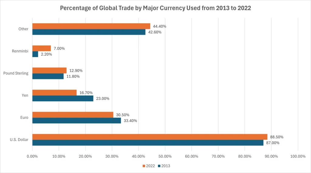 人民元の台頭にもかかわらず、米ドルは依然として世界の主要通貨である。米ドルは世界の外貨準備の60%近くを占め、世界の貿易金融の89%を占めている。