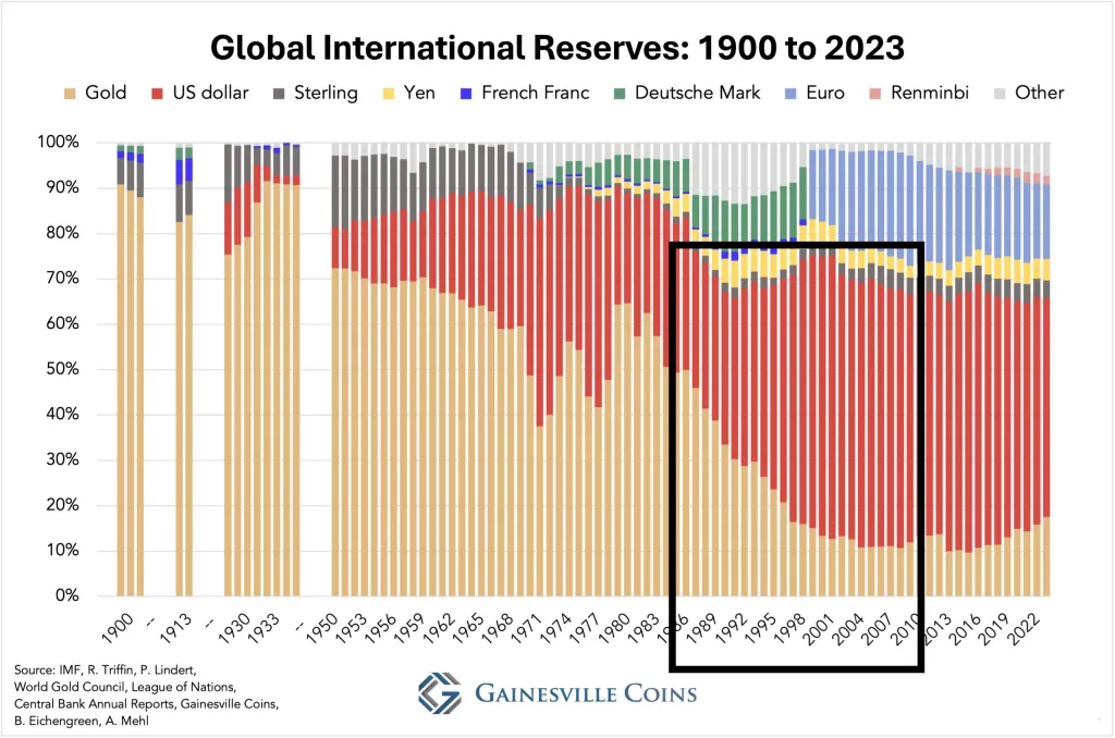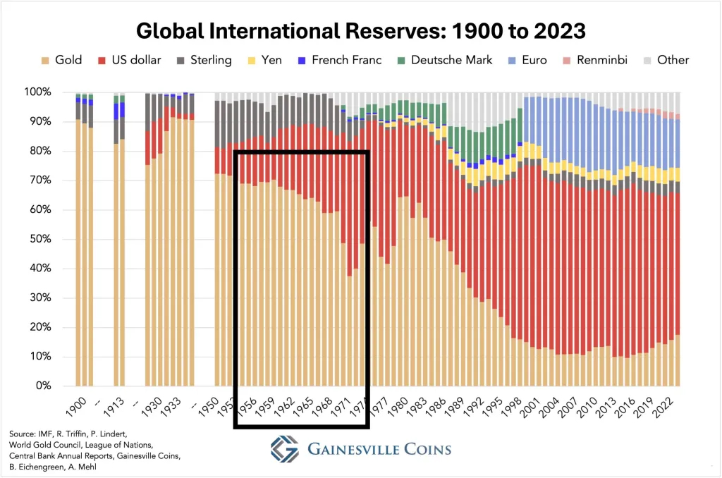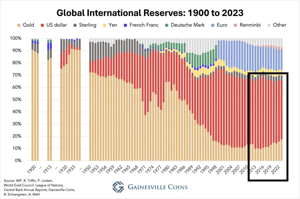 以下のチャートは、1900年から2023年まで国際準備金として世界中で保有されているさまざまな通貨と金を示している。