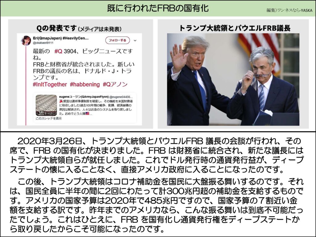 2020年3月26日、トランプ大統領とパウエルFRB議長の会談が行われ、その席で、FRBの国有化が決まりました。