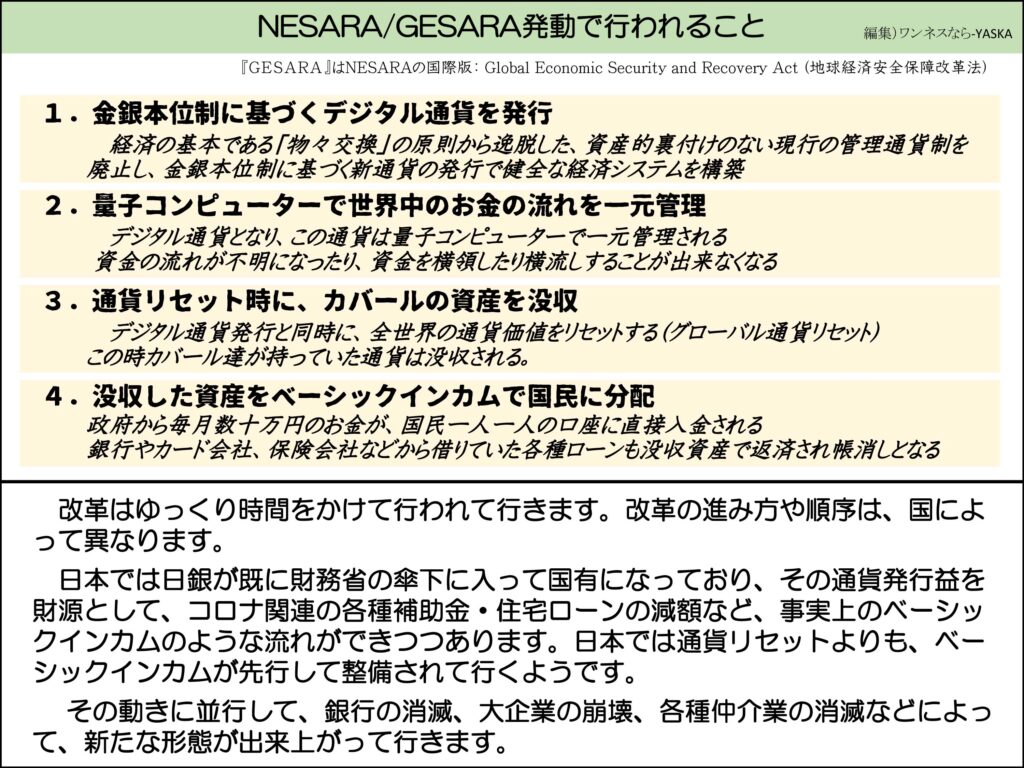 - 通貨リセット時に、カバールの資産を没収 デジタル通貨発行と同時に、全世界の通貨価値をリセットする(グローバル通貨リセット)。この時、カバールたちが持っていた通貨は没収される。