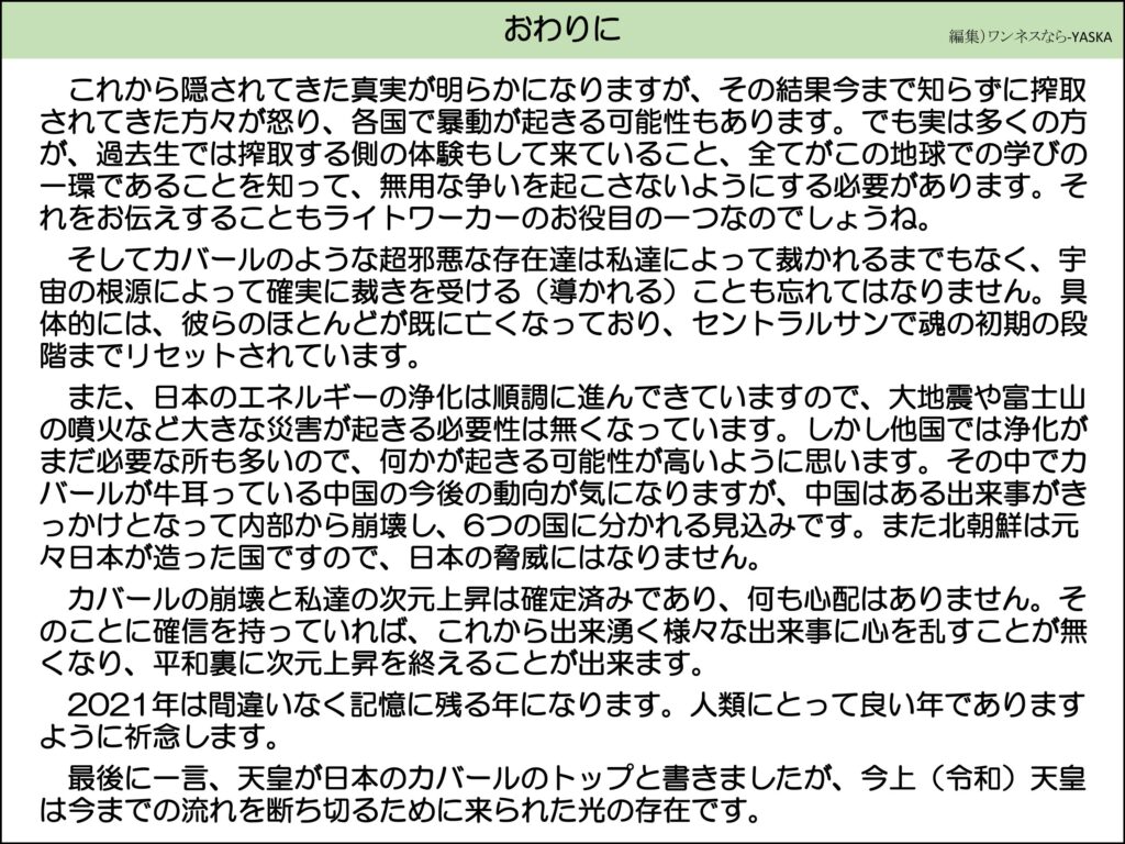 最後に一言、天皇が日本のカバールのトップと書きましたが、今上(令和)天皇は今までの流れを断ち切るために来られた光の存在です。