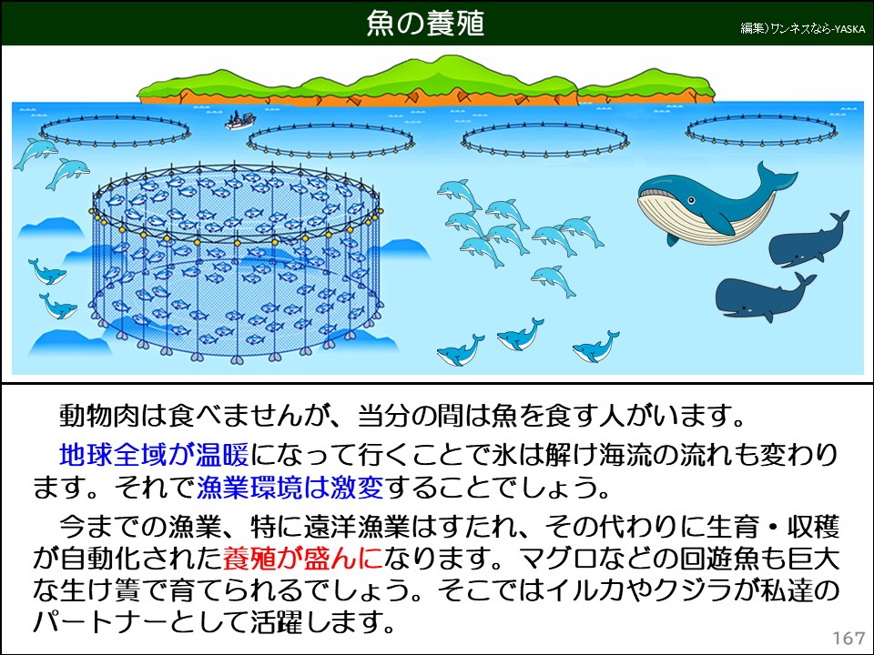 今までの漁業、特に遠洋漁業はすたれ、その代わりに生育・収穫が自動化された養殖が盛んになります。