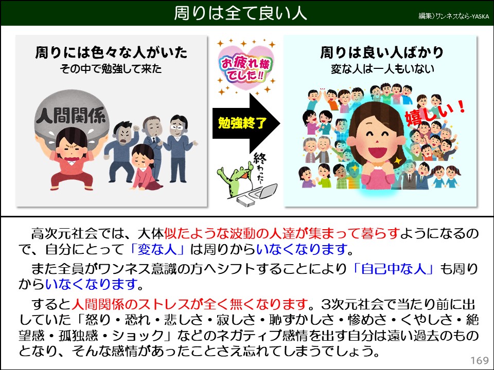 高次元社会では、大体似たような波動の人たちが集まって暮らすようになるので、自分にとって「変な人」は周りからいなくなります。