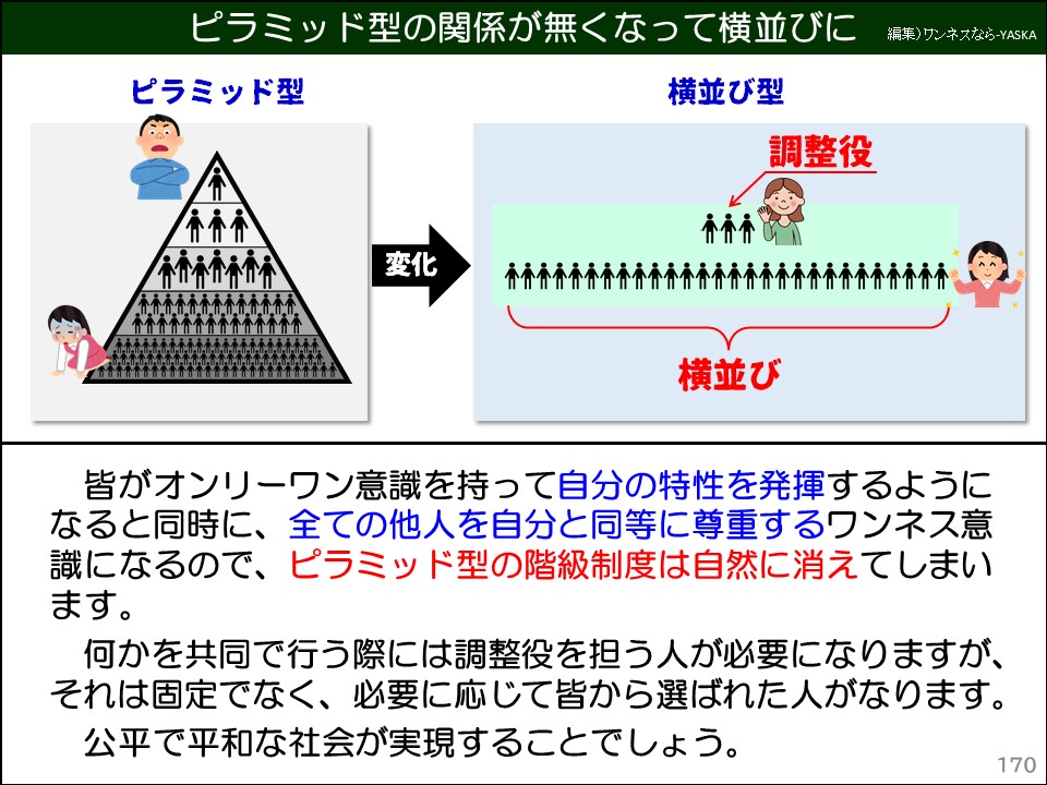 皆がオンリーワン意識を持って、自分の特性を発揮するようになると同時に、全ての他人を自分と同等に尊重するワンネス意識になるので、ピラミッド型の階級制度は自然に消えてしまいます。