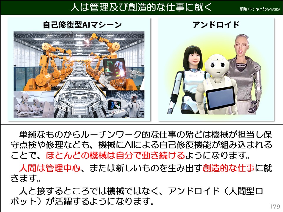 単純なものから、ルーチンワーク的な仕事の殆どは機械が担当し、保守点検や修理なども、機械のAIによる自己修復機能が組み込まれることで、ほとんどの機械は自分で動き続けるようになります。
