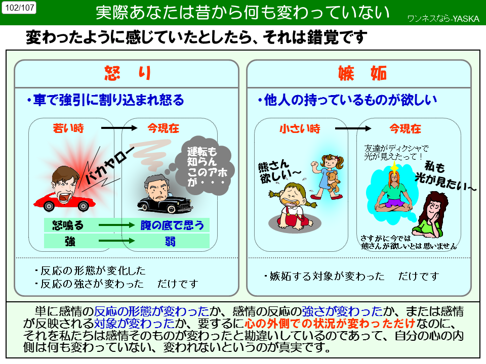 単に感情の反応の形態が変わったか、感情の反応の強さが変わったか、または感情が反映される対象が変わったか、要するに心の外側での状況が変わっただけなのに、それを私たちは感情そのものが変わったと勘違いしているのであって、自分の心の内側は何も変わっていない、変われないというのが真実です。