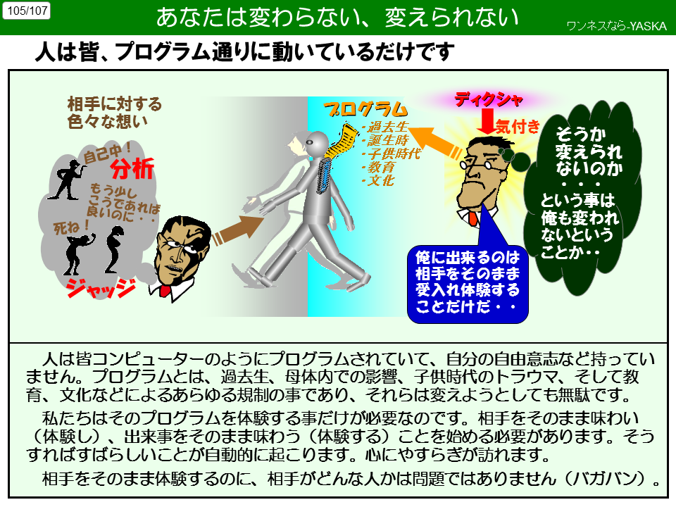 プログラムとは、過去生、母体内での影響、子供時代のトラウマ、そして教育、文化などによるあらゆる規制のことであり、それらは変えようとしても無駄です。