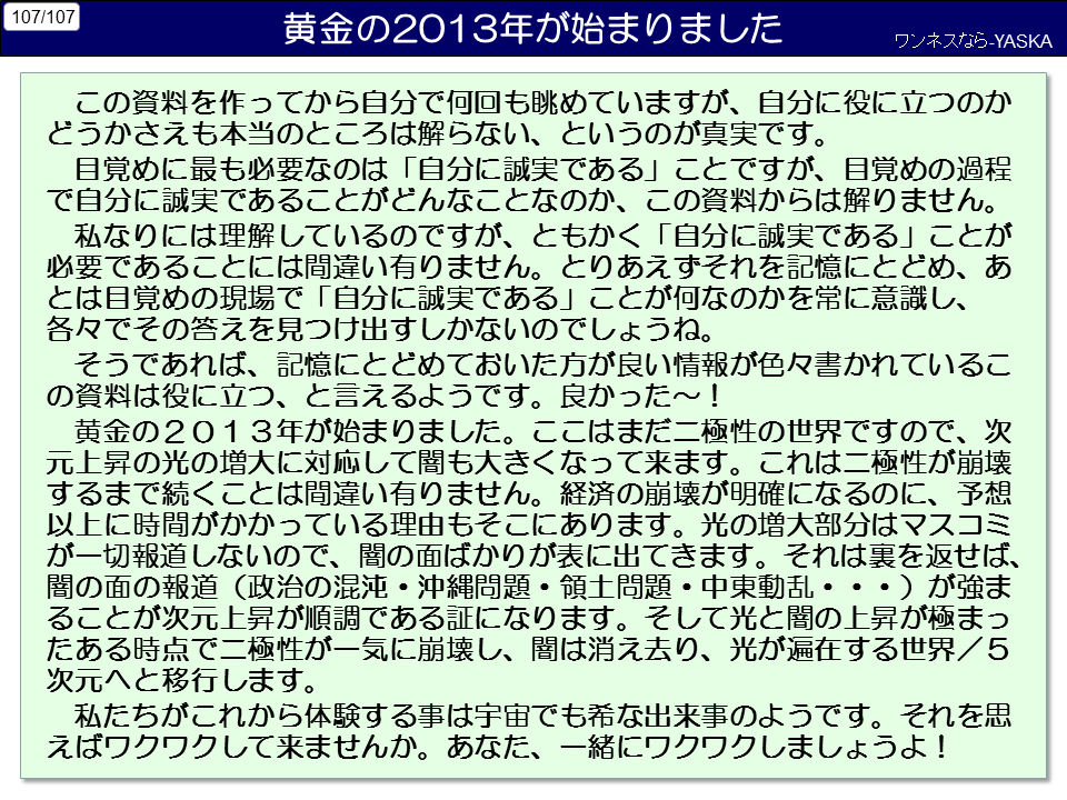 それは裏を返せば、闇の面の報道(政治の混沌・沖縄問題・領土問題・中東動乱…)が強まることが次元上昇が順調である証になります。