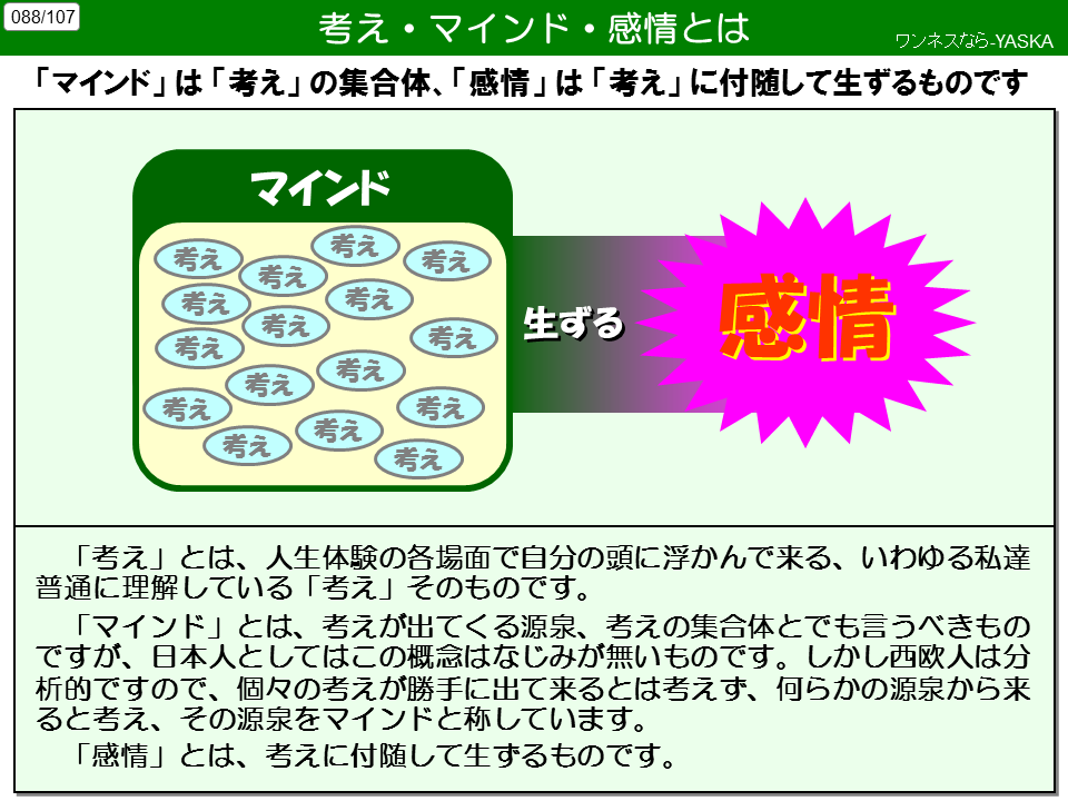 「マインド」は「考え」の集合体、「感情」は「考え」に付随して生ずるものです