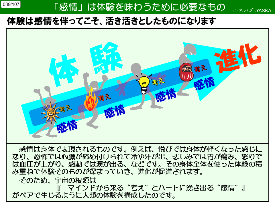 そのため、宇宙の根源は「マインドから来る『考え』とハートに湧き出る『感情』」がペアで生じるように人類の体験を構成したのです。