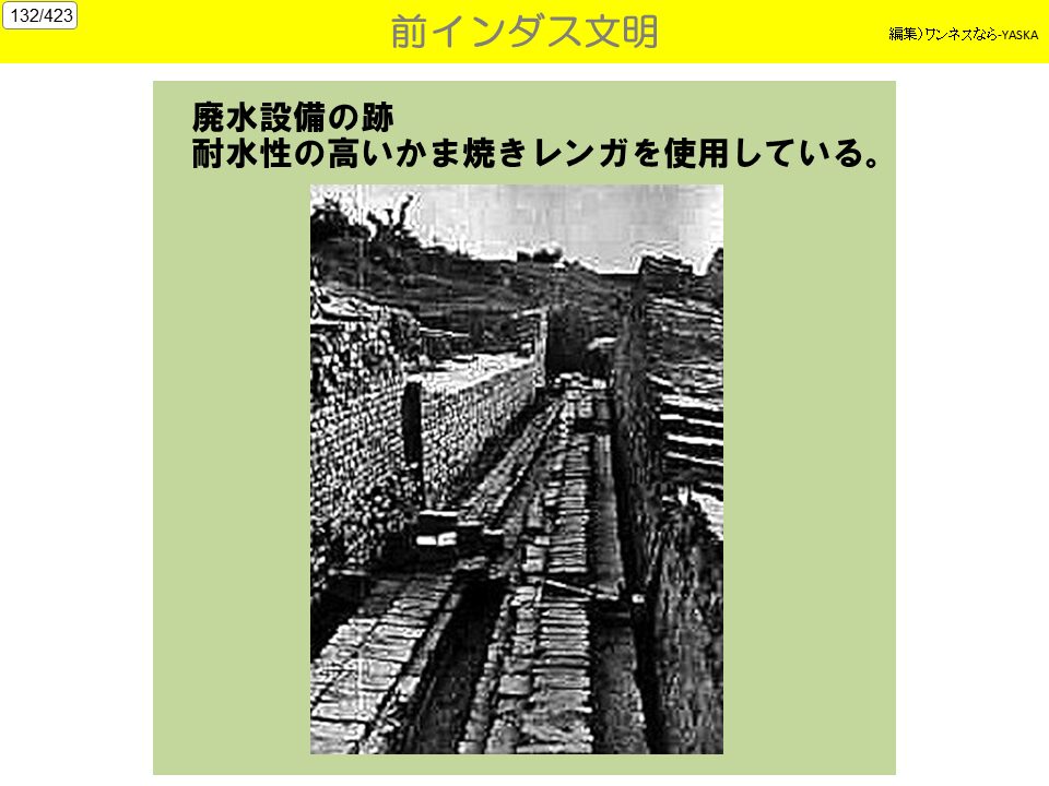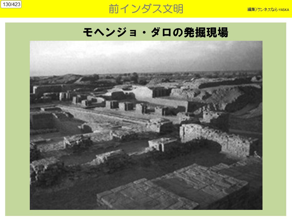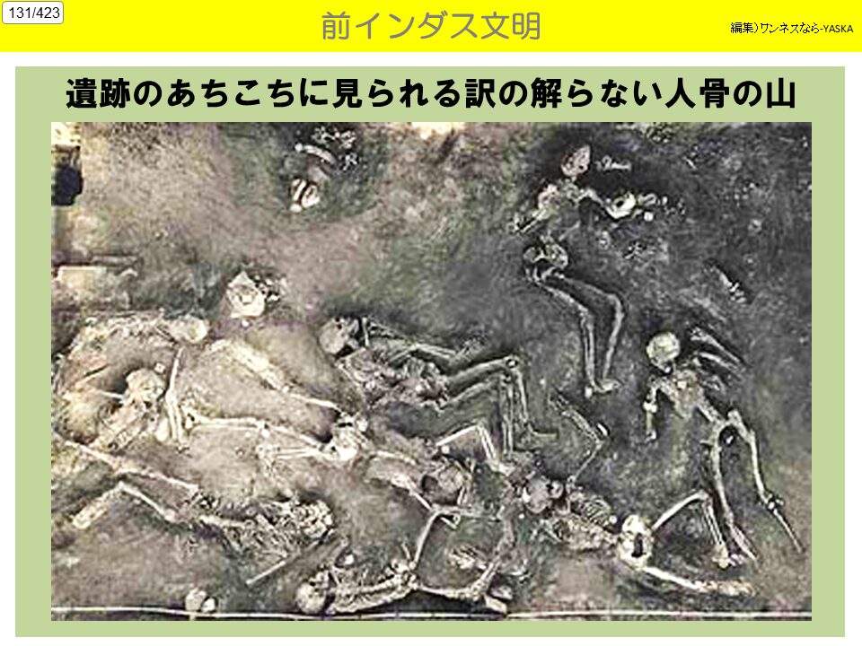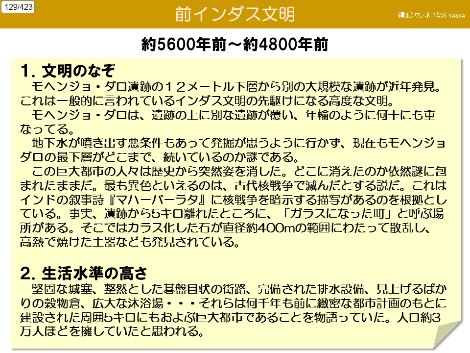 1. 文明のなぞ モヘンジョ・ダロ遺跡の12メートル下層から、別の大規模な遺跡が近年発見。これは一般的に言われている、インダス文明の先駆けになる高度な文明。モヘンジョ・ダロは、遺跡の上に別な遺跡がおおい、年輪のように何重にも重なっている。地下水が噴き出す悪条件もあって発掘が思うように行かず、現在もモヘンジョ・ダロの最下層がどこまで続いているのか謎である。この巨大都市の人々は歴史から突然姿を消した。どこに消えたのか以前謎に包まれたままだ。最も異色といえるのは、古代核戦争で滅んだとする説だ。これはインドの叙事詩じょじし『マハーバーラタ』に核戦争を暗示する描写があるのを根拠こんきょとしている。事実、遺跡から5キロ離れたところに、「ガラスになった町」と呼ぶ場所がある。そこではガラス化した石が直径約400mの範囲にわたって散乱し、光熱で焼けた土器なども発見されている。