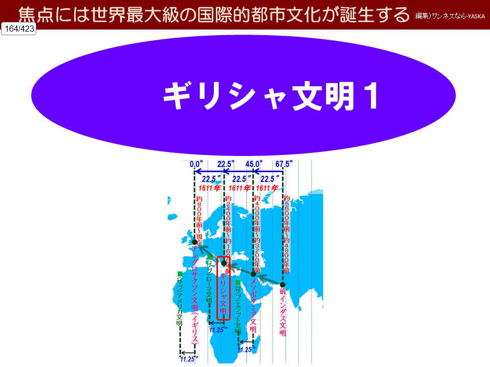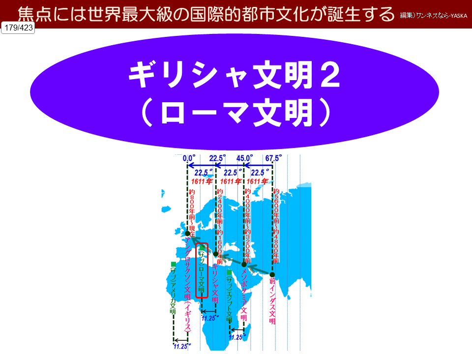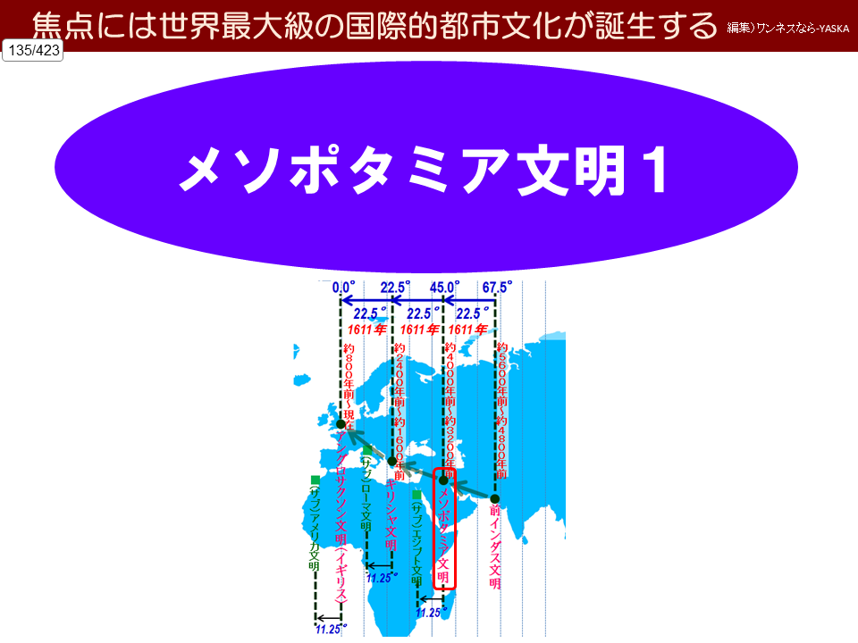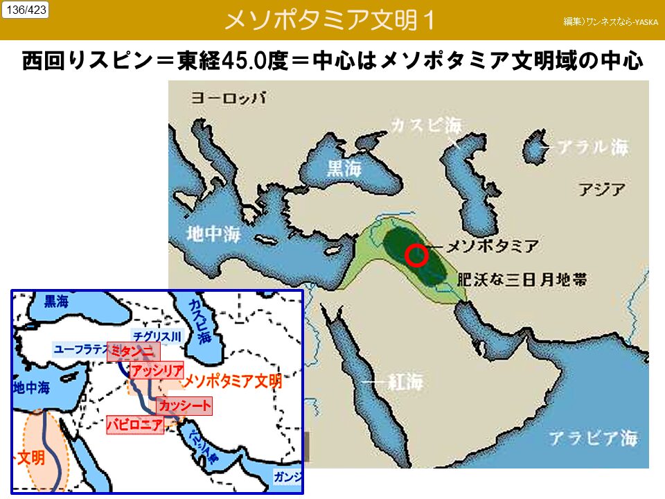 西回りスピン = 東経45.0度 = 中心はメソポタミア文明域の中心