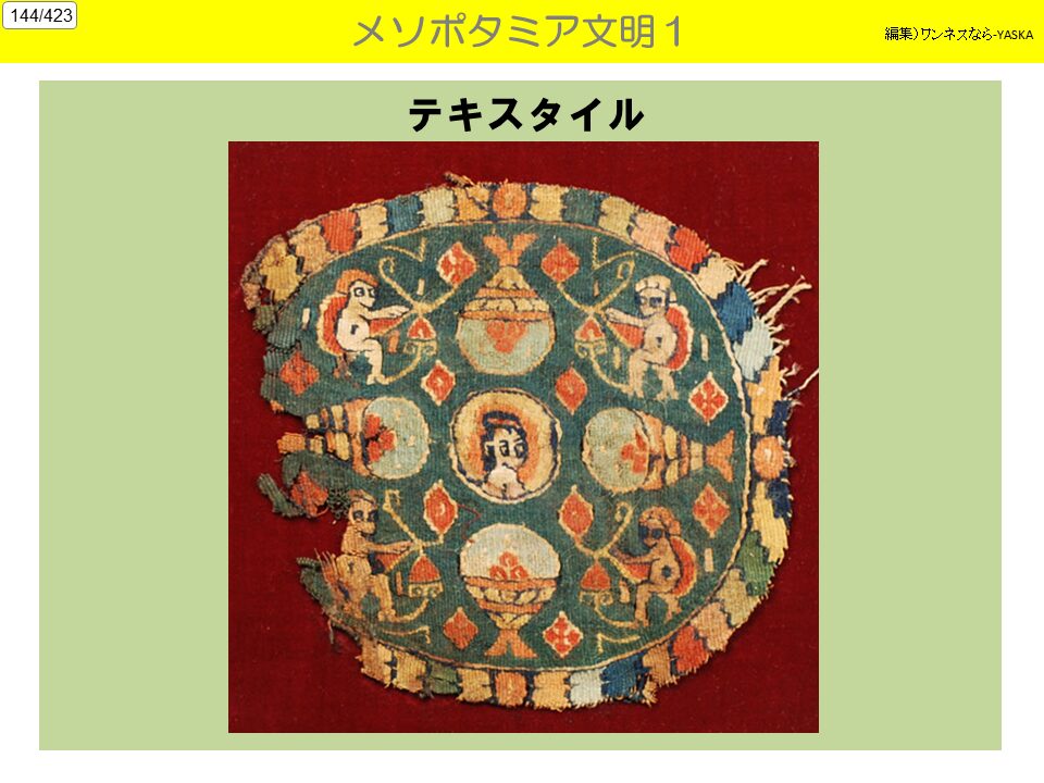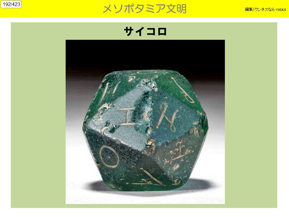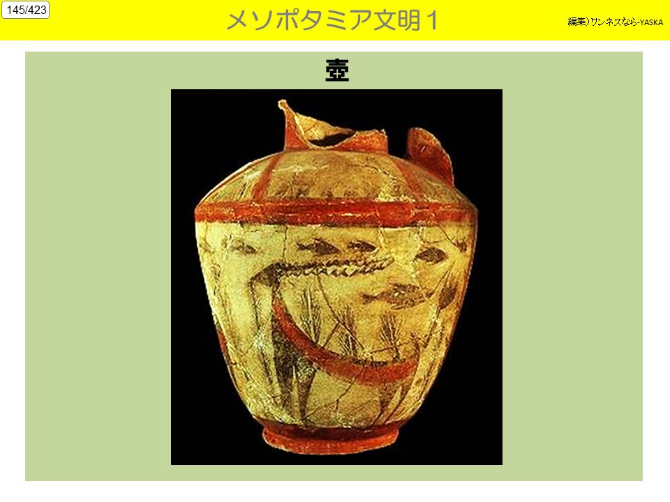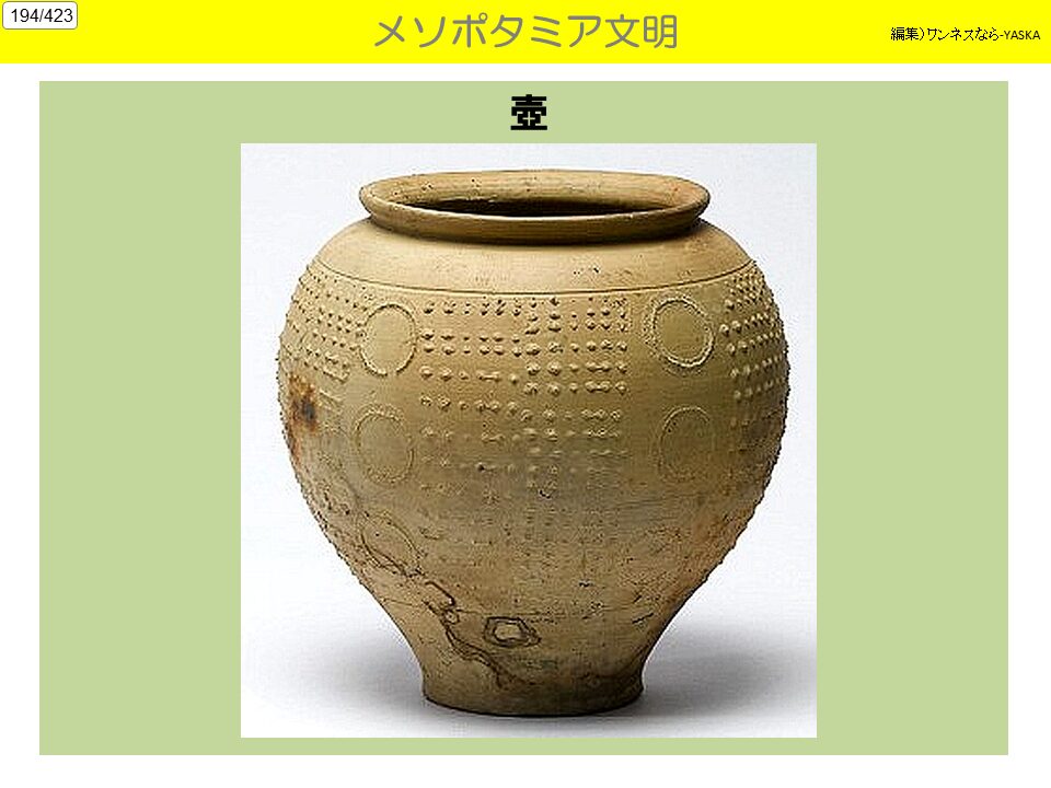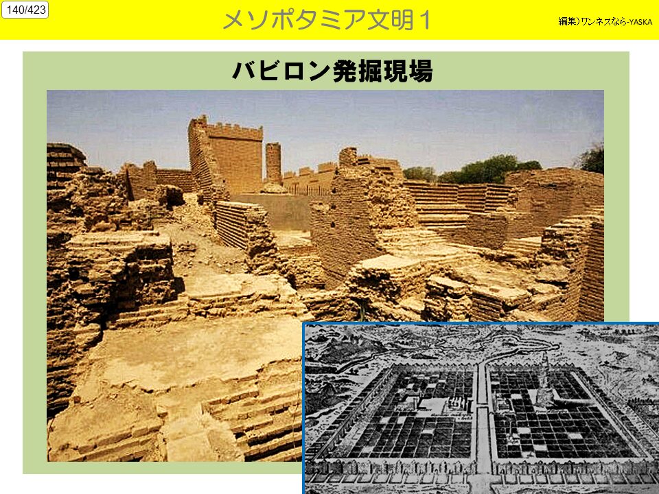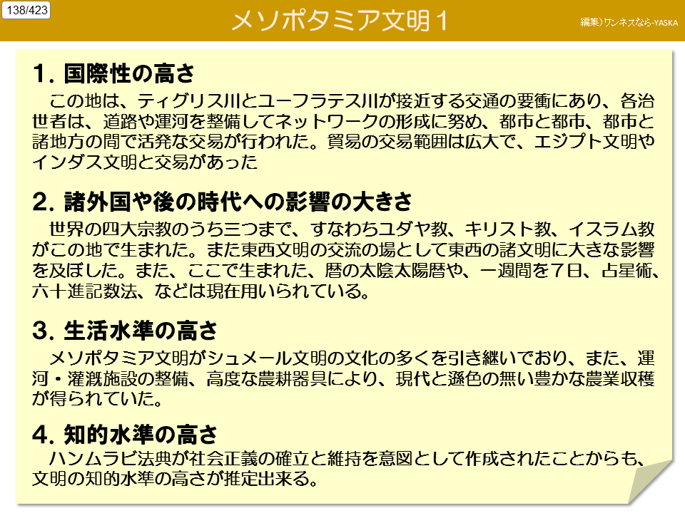 3. 生活水準の高さ メソポタミア文明が、シュメール文明の文化の多くを引き継いでおり、また、運河・灌漑かんがい施設の整備、高度な農耕器具により、現代と遜色けんしょくのない豊かな農業収穫が得られていた。