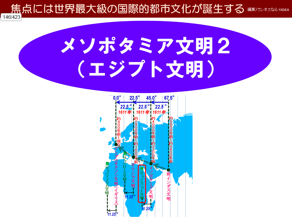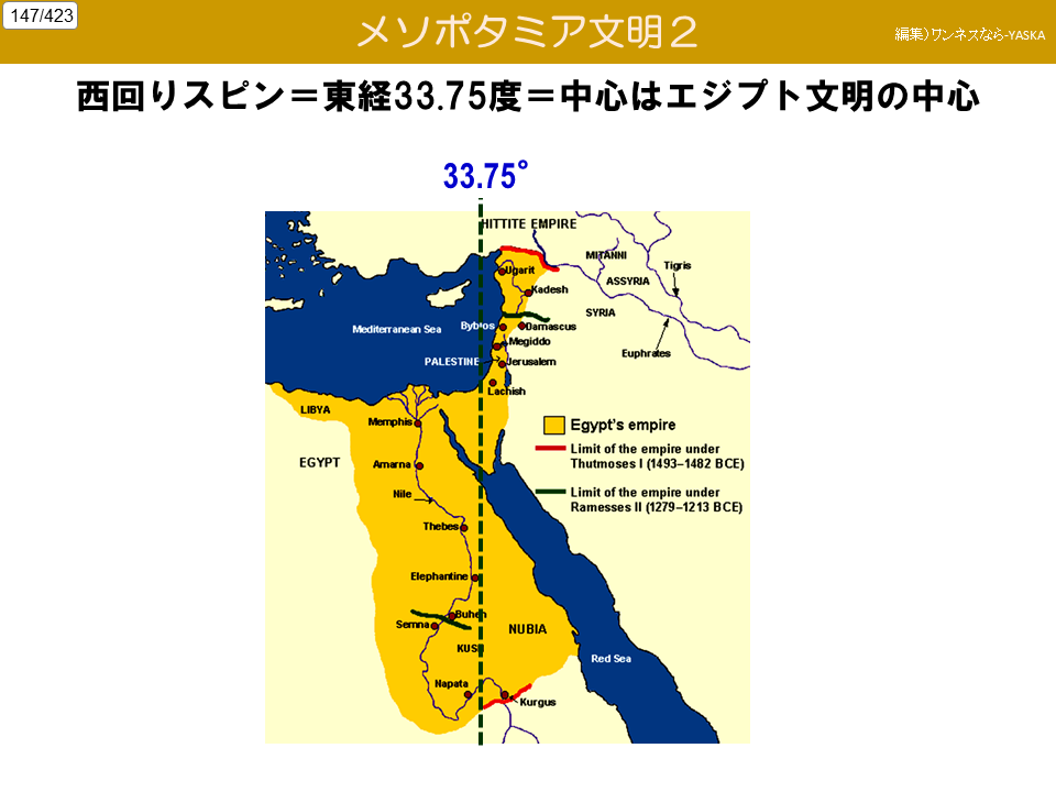 西回りスピン = 東経33.75度 = 中心はエジプト文明の中心