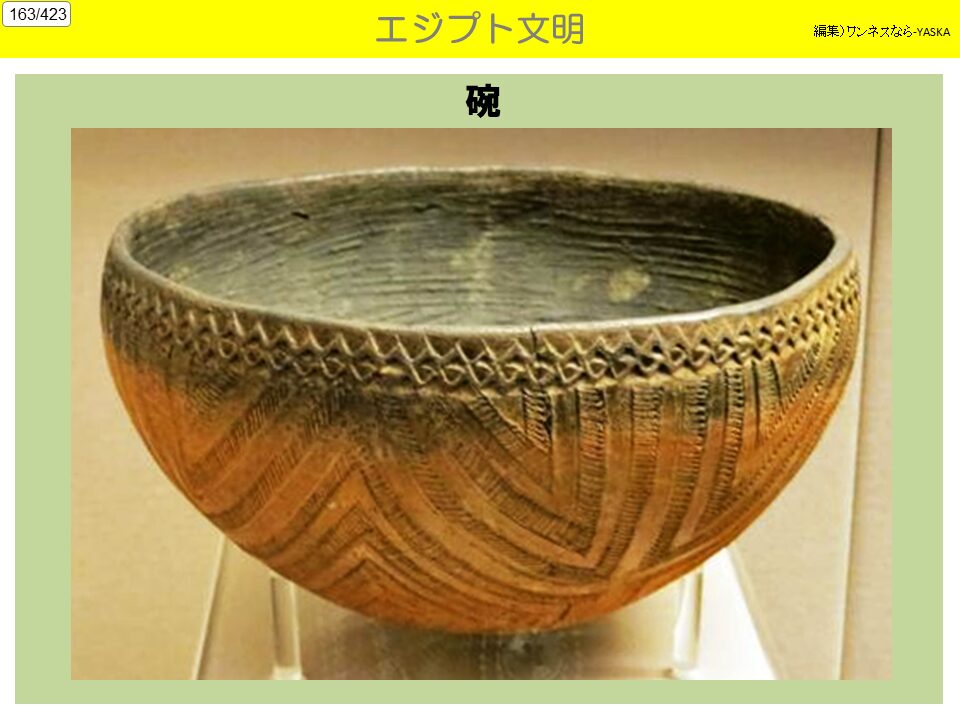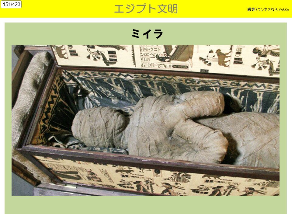 4. 知的水準の高さ エジプト人は死後の世界に対して独特の関心を持っていた。彼らの死後の世界を描いたのが「死者の書」であり、死後に再生するための肉体を保存するのがミイラである。文化面では、イクナートンが、アマルナ美術と呼ばれる写実的で活き活きとした芸術を残した。