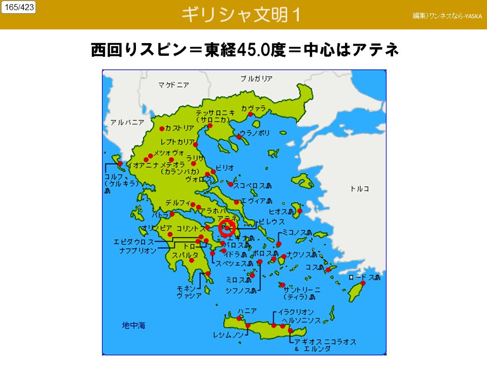 西回りスピン = 東経45.0度 = 中心はアテネ