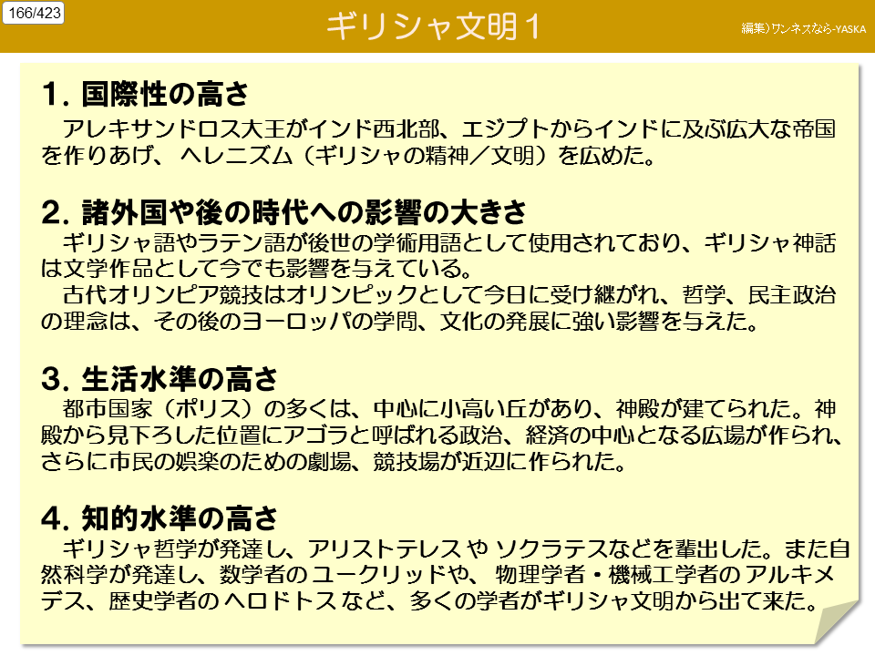 1. 国際性の高さ アレキサンドロス大王がインド西北部、エジプトからインドに及ぶ広大な帝国を作り上げ、ヘレニズム(ギリシャの精神/文明)を広めた。