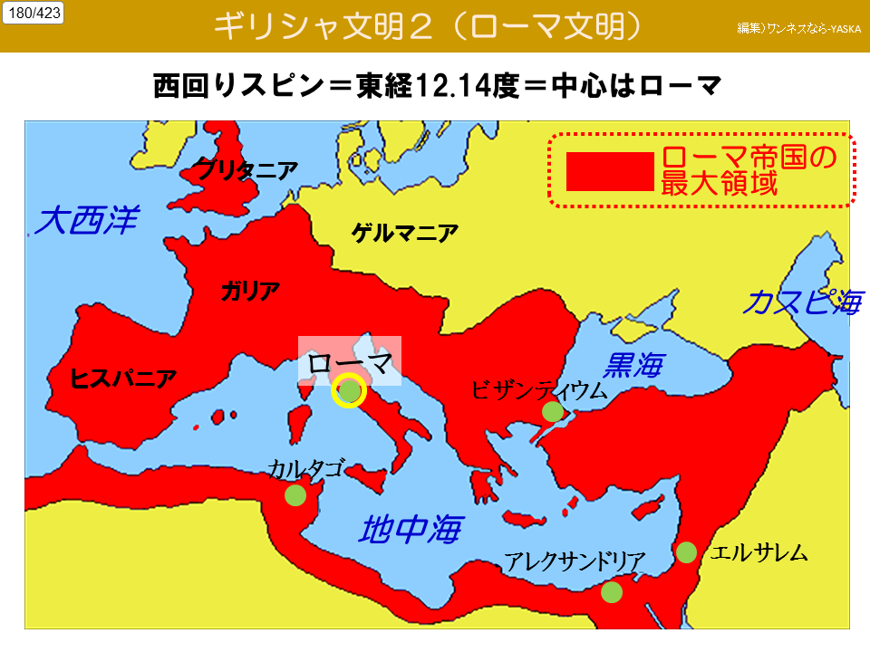 西回りスピン = 東経12.14度 = 中心はローマ