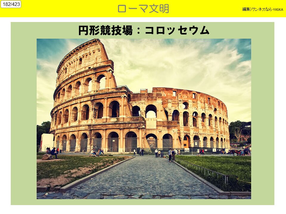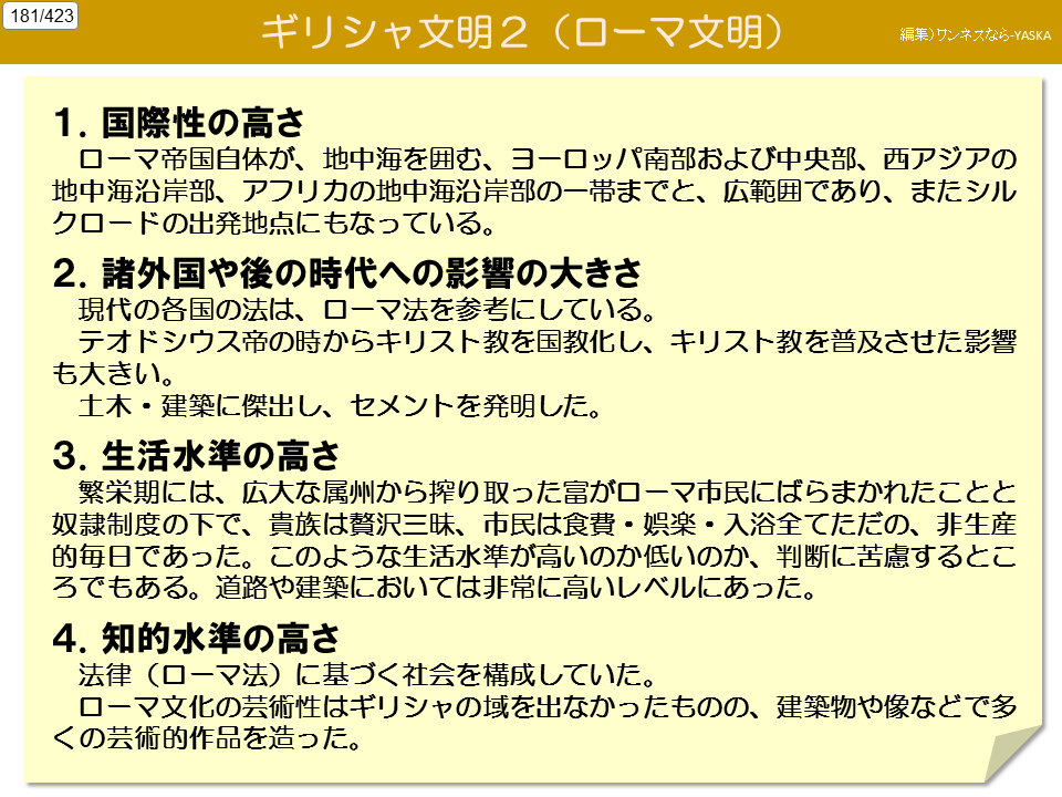 4. 知的水準の高さ 法律(ローマ法)に基づく社会を構成していた。ローマ文化の芸術性はギリシャの域を出なかったものの、建築物や像などで多くの芸術的作品を造った。