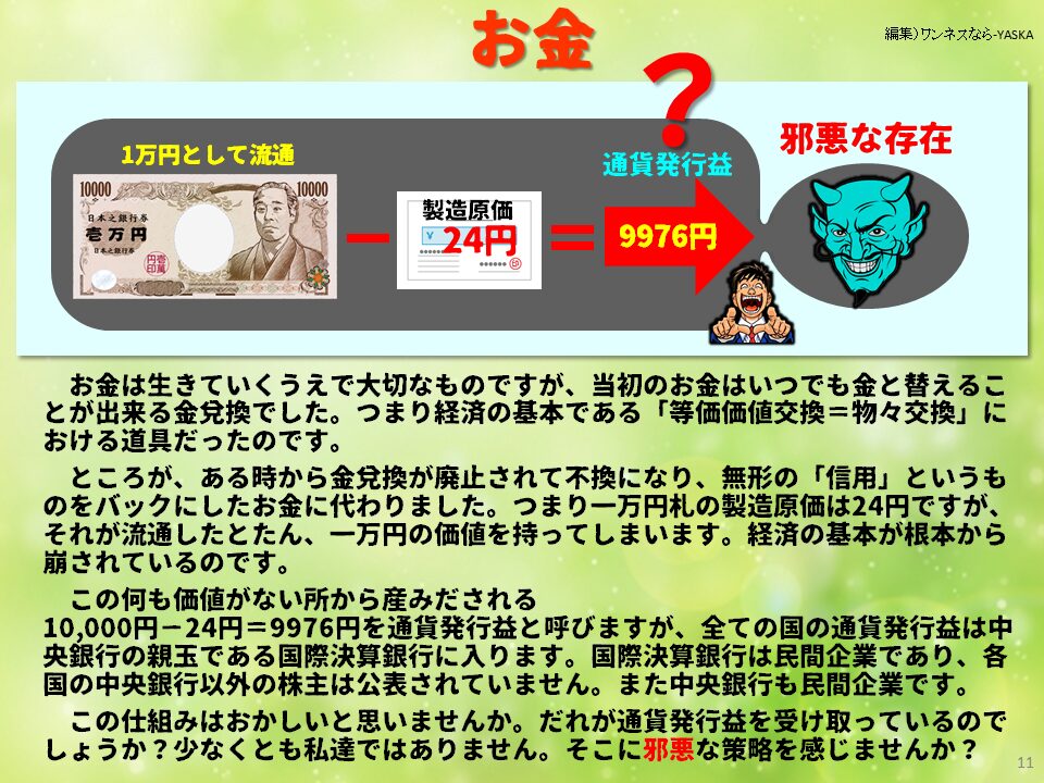 この、何も価値がない所から生み出される、10,000円 – 24円 = 9,976円を通貨発行益と呼びますが、全ての国の通貨発行益は、中央銀行の親玉である国際決算銀行に入ります。