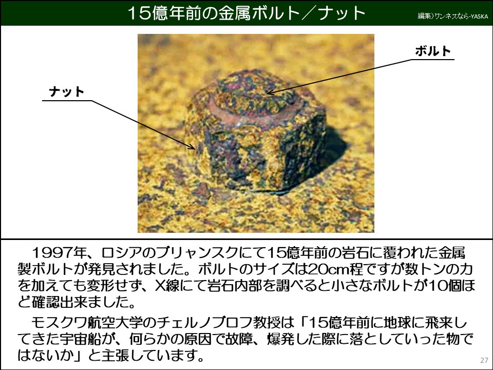 1997年、ロシアのブリャンスクにて、15億年前の岩石に覆われた金属製ボルトが発見されました。