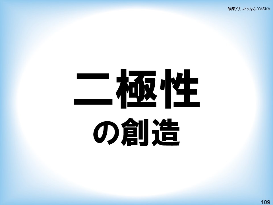 具体的には、まず、男性性優位の二極の世界で争いを通して分離意識を学び、最後に、女性性優位の世界を具現化して、全てを包含ほうがんしワンネスを果たす、という方法です。