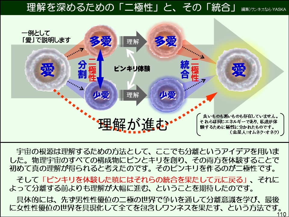 そして「ピンキリを体験したあかつきにはそれらの統合を果たして元に戻る」、それによって分離する前よりも理解が大幅に進む、ということを期待したのです。